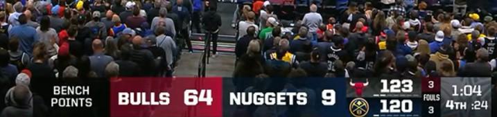 据统计,在第四节还剩1分04秒时,公牛队与掘金队的替补得分比为悬殊的64-9,在最后时刻,公牛替补后卫多森姆通过罚球奠定胜局,让这个对比定格为66-9。