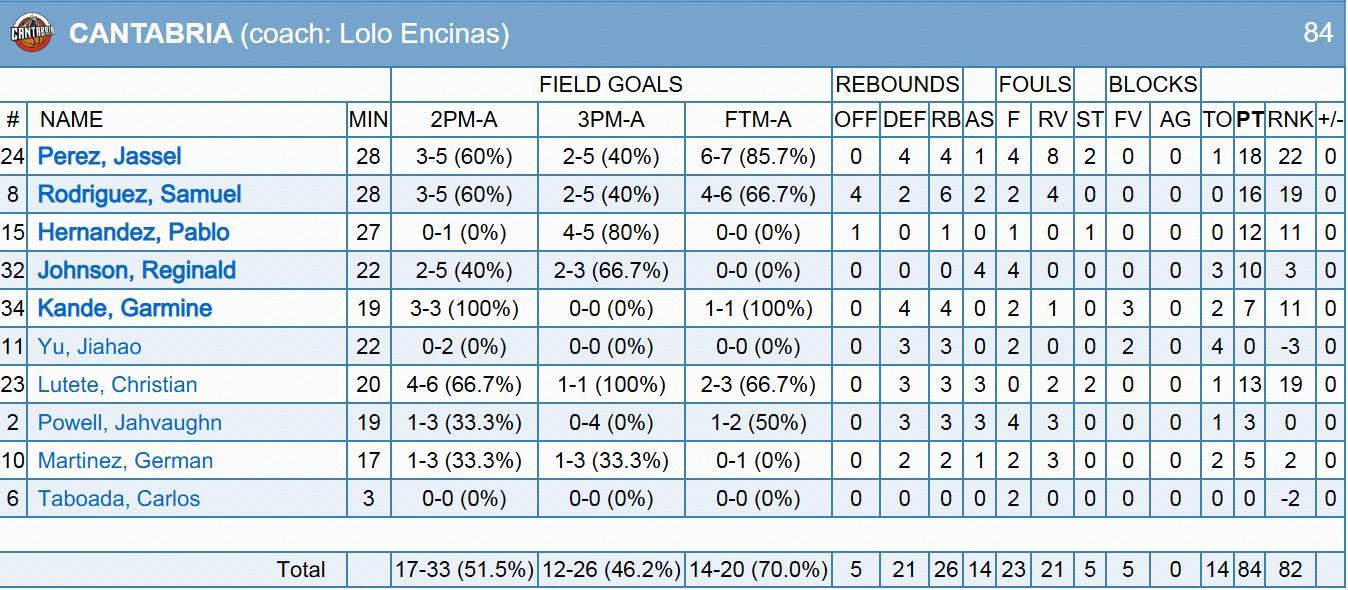 埃斯特拉首发中锋加明-坎德登场19分钟,投篮3中3,罚球1中1得到7分4篮板3盖帽2次失误。