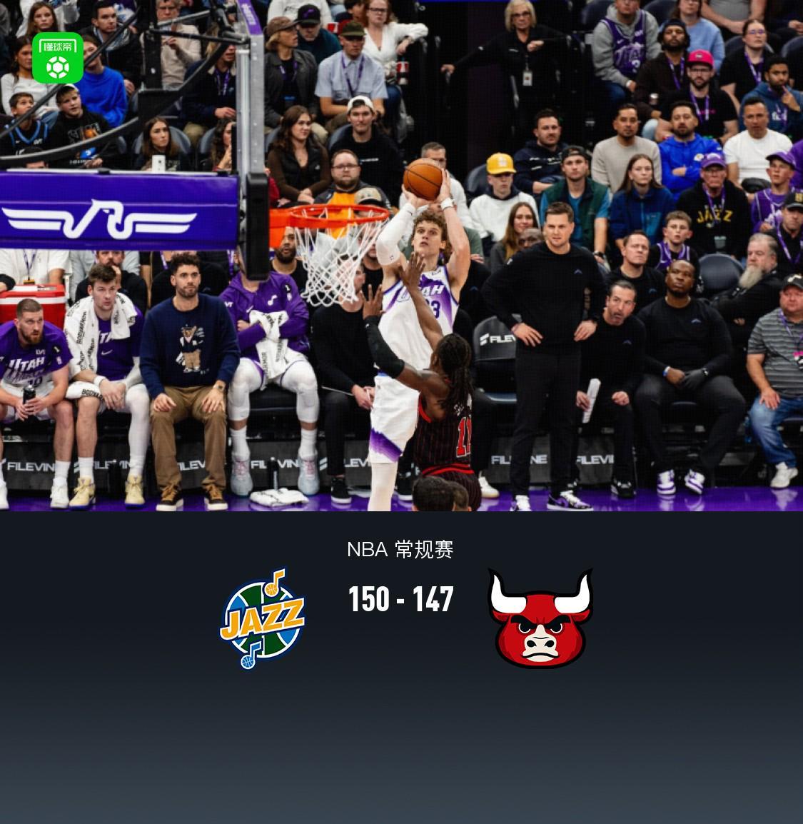爵士双加时150-147险胜公牛,马尔卡宁47分,乔治3分准绝杀